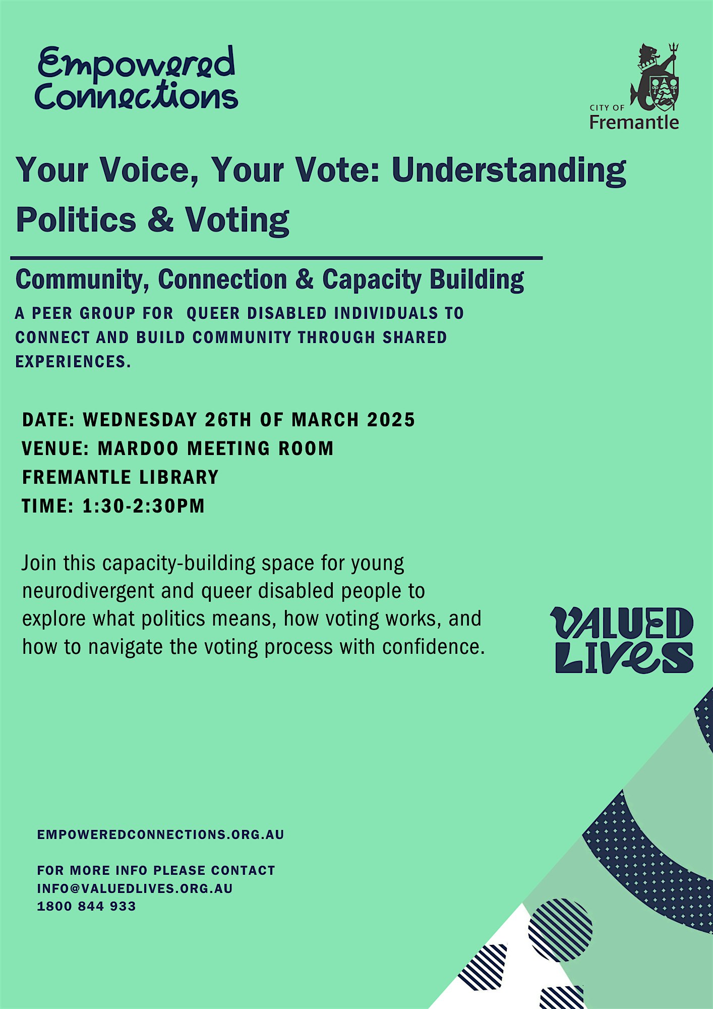 TSH 36 Dodd Street, Wembley, WA, AustraliaMicroenterprise - a pathway to meaningful employmentJoin us for an inspiring workshop. Three microenterprise business owners will share their journeys of starting and running their businesses. You’ll gain valuable insights and practical advice to embark on your own entrepreneurial path. The event is organised by Valued Lives’ capacity building service, Empowered Connections. What to Expect:Introduction […]